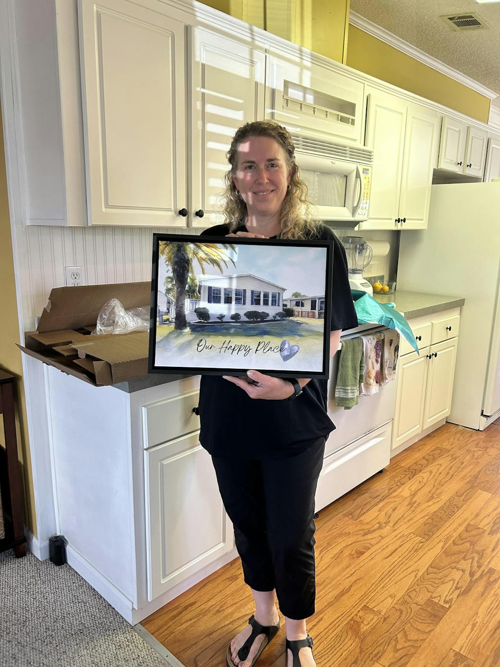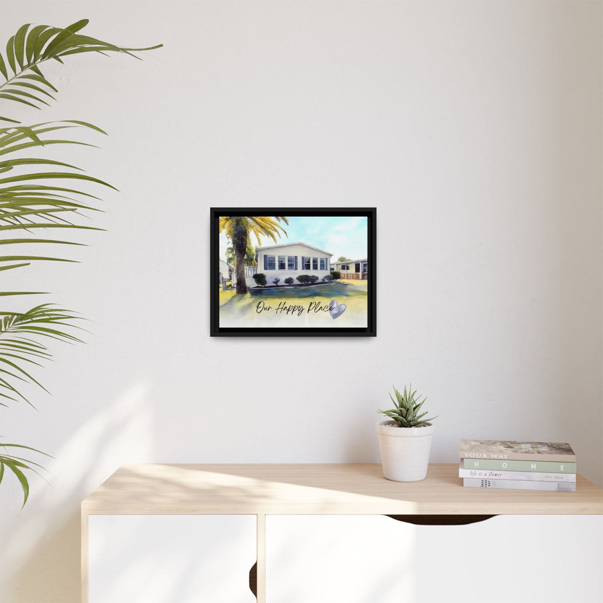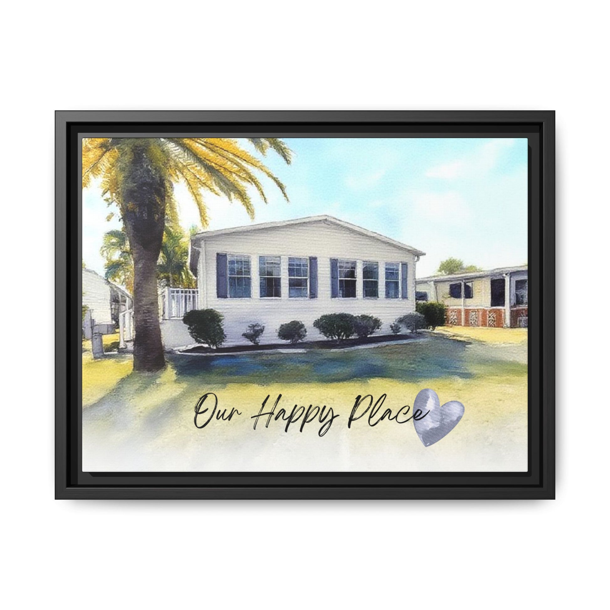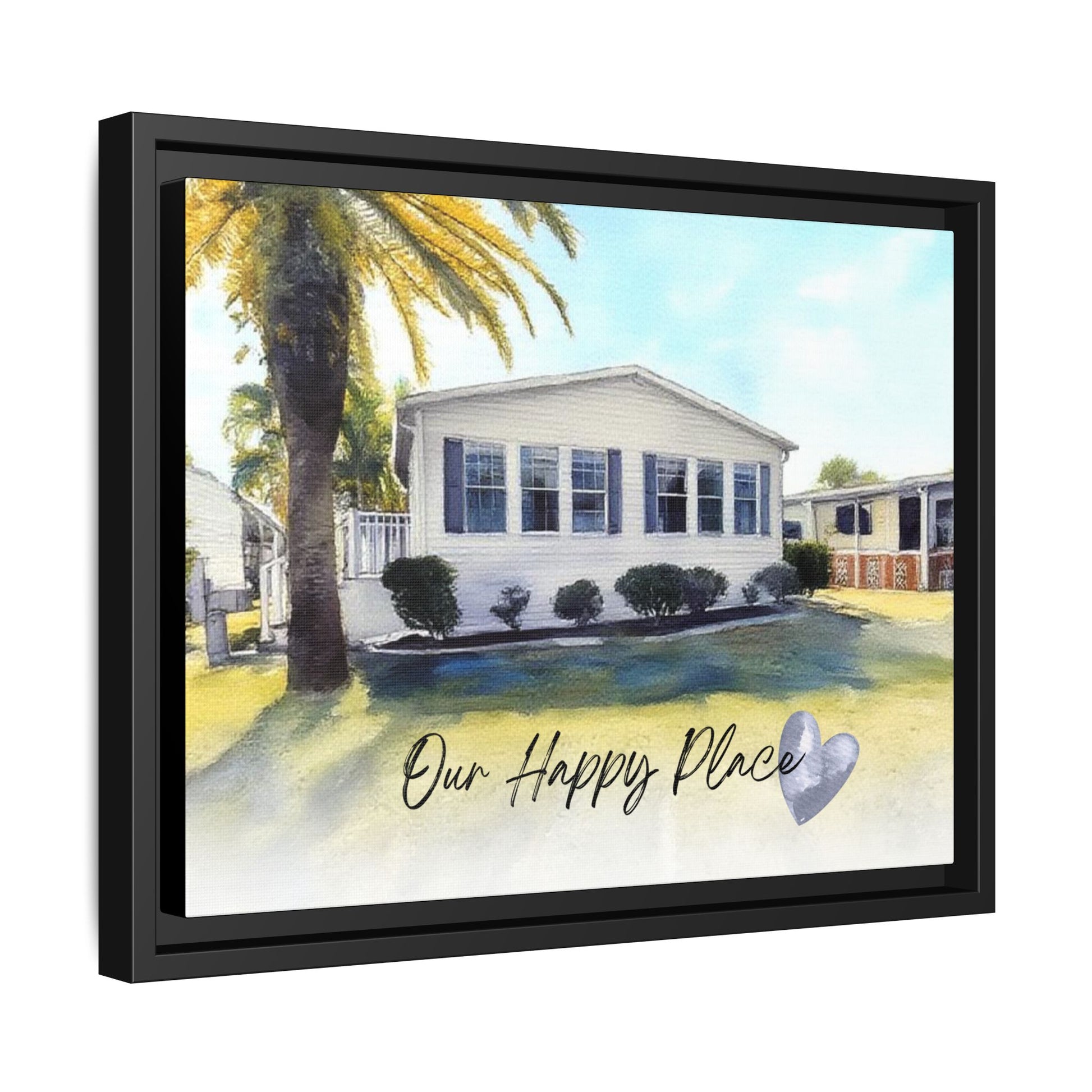A framed matte canvas that brings a sunlit, hand-painted memory to your wall. Soft watercolor tones and a gentle script—"Our Happy Place"—sit beneath swaying palms and a cozy home, making the scene feel like a remembered afternoon. The matte finish softens glare and adds an artful texture, while the slim pine frame gives it a grounded, gallery-ready presence that suits living rooms, entryways, or a vacation home gallery wall.